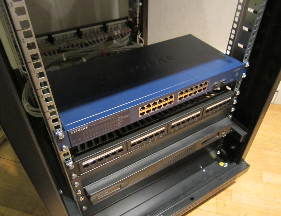 I also mounted my new UPS which is a Eaton Powerware 5115RM (1000W/1500VA). It should be able to handle the load for couple of minutes at least. At the top is my 24 port GbE Netgear smart switch (GS724T-300).