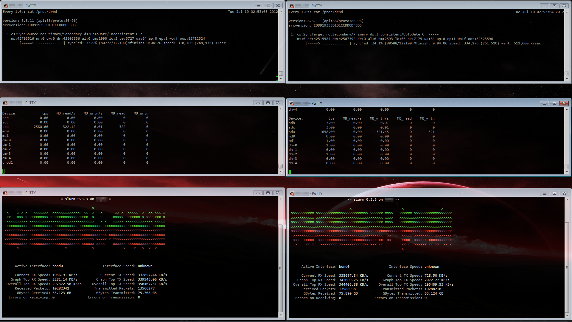 Synchronizing the SSD drives using DRBD shows pretty nice results of around 320MB/s. However, note that this doesn’t reflect the actual performance of the DRBD device itself. This is only showing the speed of the initial synchronization.